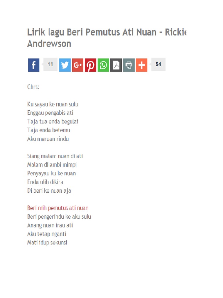 Music beri pemutus ati nuan 100% free! 0 ratings0% found this document useful (0 votes). Savesave beri meh pemutus ati nuan for later. Rickie andrewson beri pemutus ati nuan. Beri pemutus ati nuan rickie andrewson lirik lagu cover by bujang simanggang 2014.
