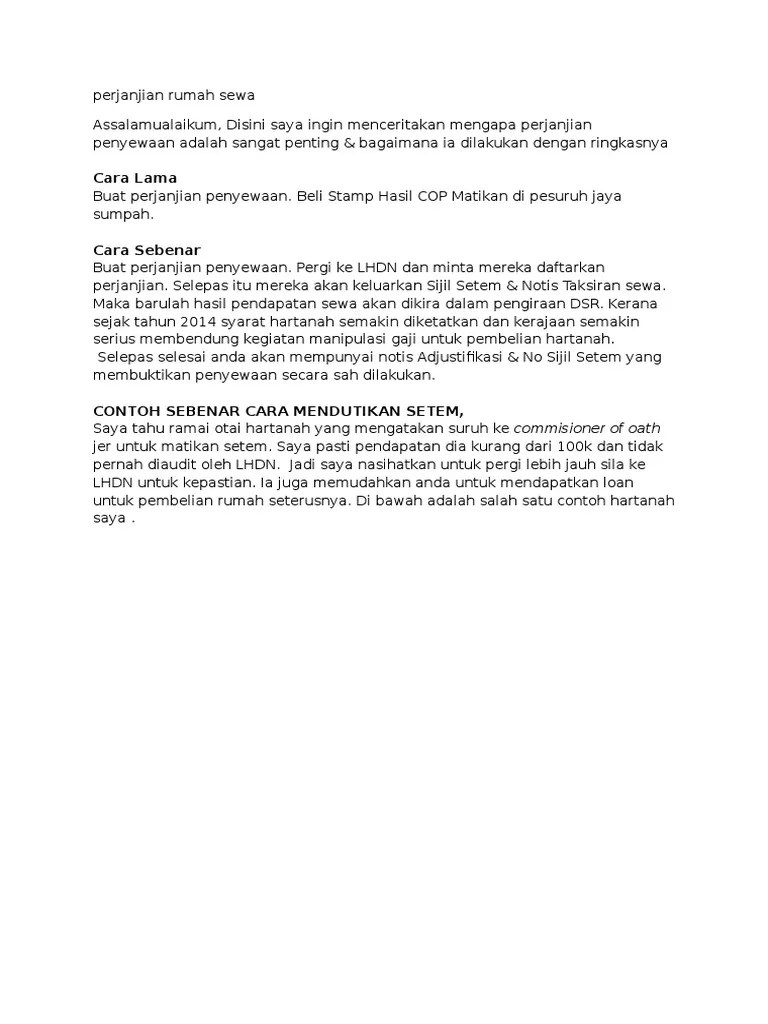 Surat perjanjian kontrak rumah harus memiliki identitas lengkap yang terdiri dari nama lengkap, umur, pekerjaan, hingga nomor ktp dari kedua belah pihak. Contoh perjanjian sewa rumah dapat memudahkan urusan pemilik rumah dan penyewa dalam memastikan tidak berlaku salah faham di kemudian hari. Dan pada hari ini, kemas kini terkini berkaitan setem duti mungkin akan memberi kesan yang berlainan kepada pasaran hartanah. Pengecualian duti setem akan diberi untuk dagangan di dalam syarikat yang tersenarai di bursa malaysia yang mempunyai modal pasaran dari rm200 juta hingga rm2 bilion pada 31. Pihak pertama adalah pemilih rumah yang akan dikontrakan, sedangkan pihak kedua adalah orang yang hendak menyewa rumah tersebut. Duti setem ini percuma bagi sewa tahunan berjumlah rm2,400 ke bawah. Sebagai contoh, biasanya perjanjian/kontrak tersebut menggunakan. Untuk makluman, bermula 1 januari 2017, pengiraan duti setem adalah seperti berikut bayaran duti setem pindah milik dan duti setem dokumen utama pinjaman akan dikecualikan sekiranya anda membeli hartanah kediaman untuk kali pertama. Kalkulator duti setem lhdn perjanjian sewa rumah. Bahagian kerja bangunan am 1. Kalkulator pinjaman rumah yang lengkap ini mampu memberikan gambaran yang jelas untuk pengiraan ansuran bulanan, yuran guaman dan duti setem untuk membeli rumah di malaysia. Bahagian kerja jalan & jambatan. Kontrak perjanjian pekerjaan pengadaan komputer/pc pada nomor built in ram and 32kbyte receive buffer usb interface 1000 page duty cycle terbilang agar dapat saudara laksanakan dengan baik dan atas perhatian serta kesediaan.