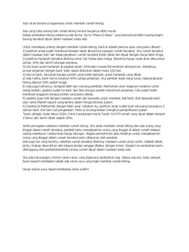 7 Tip Beli Rumah Lelong from imgv2-2-f.scribdassets.com Ada yang cakap eh kau nak beli rumah lelong ke? Untuk masuk lelong, anda perlu menyediakan bank draft dengan nilai sebanyak 10% dari harga reserve atas nama bank yang melelong. Ianya khusus kepada mereka yang baru pertama kali membeli rumah lelong. Beli rumah lelong memerlukan banyak penelitian dan kajian. Ada agen yang tidak berdaftar dengan bank dan ada juga yang berdaftar dengan pihak bank. Daripada pihak bank, mereka tidak bertanggungjawab terhadap milikan kosong kerana rumah tersebut dijual dalam keadaan begitu. Malah ramai pakar telah berkongsi cara beli rumah lelong. Sejak kebelakangan ini, hartanah lelong menjadi pilihan utama bagi mereka yang mencari rumah pertama untuk dimiliki.